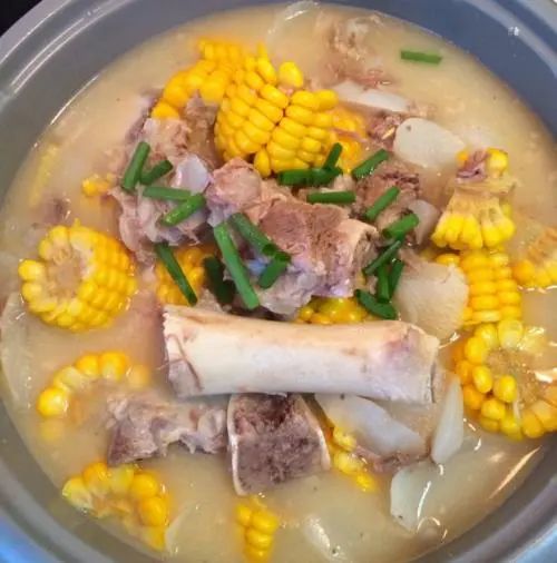 (3)煲内放入适量清水,水开后加入姜片、玉米段、排骨块,用大火煲开,改中火煲40分钟。