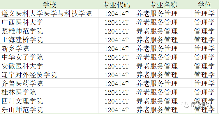 遵义医科大学医学与科技学院、广西医科大学、楚雄师范学院、上海建桥学院、新乡学院、中华女子学院、安徽医科大学、辽宁对外经贸学院、齐鲁医药学院、桂林医学院、四川文理学院、乐山师范学院等12所高校申请备案“养老服务管理”本科专业。